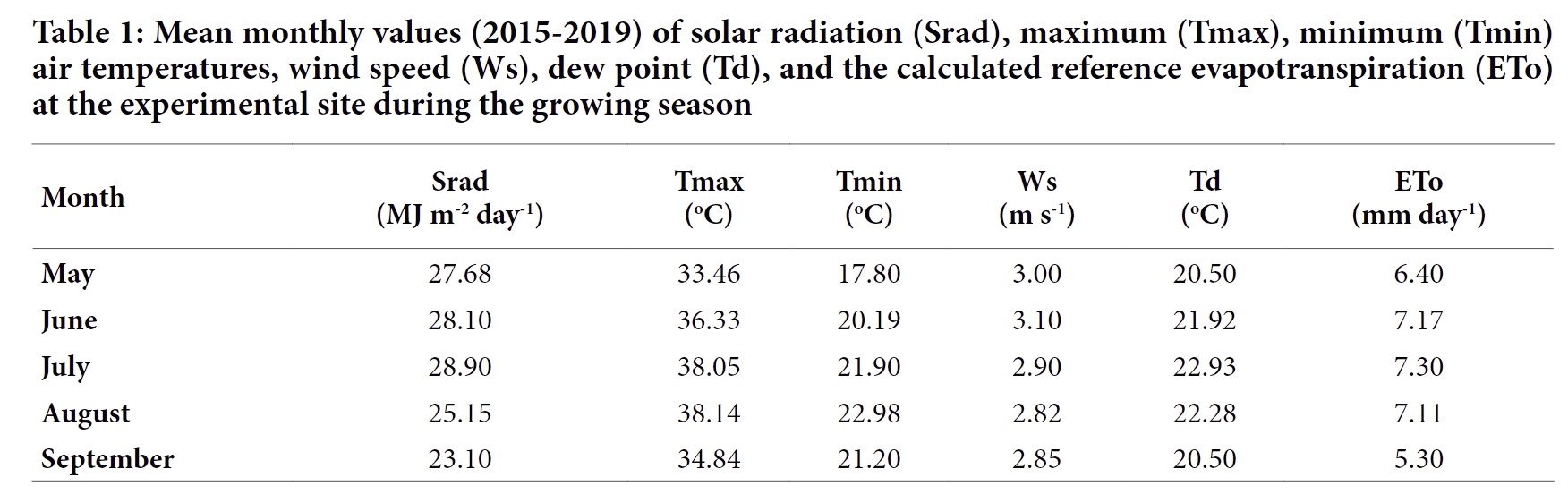 A field experiment was conducted in a private farm (30o 40’ N latitude, 32o 15’ E longitude, and 10.0 m above mean sea level), Ismailia Governorate, Egypt, during 2020 and 2021 summer growing seasons. The experimental site represents the newly reclaimed sandy soil of East Nile Delta region. The climate is cool in winter with, a mean air temperature of about 13.0°C. Summer is hot with no rain, and mean air temperatures varies from 25.6 to 30.6°C during June, July, and August, as well as mean wind speed of 2.93 m/h during the daytime for these months. Average monthly weather data at the experimental site for the period from 2015 to 2019 are presented in table 1.