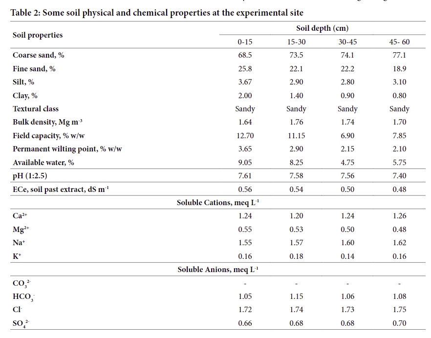 Samples from the upper 60 cm soil surface were collected at 15 cm intervals to determine the soil physical, chemical properties and soil-moisture constants (Table 2). Chemical and physical soil parameters were determined according to the standard method described by Tan (1996). The values of available macronutrients (N, P, and K) were 16.7, 5.5, and 65.1 mg kg−1, respectively. Accordingly, the soil was characterized by low fertility and insufficient available water for plant growth.