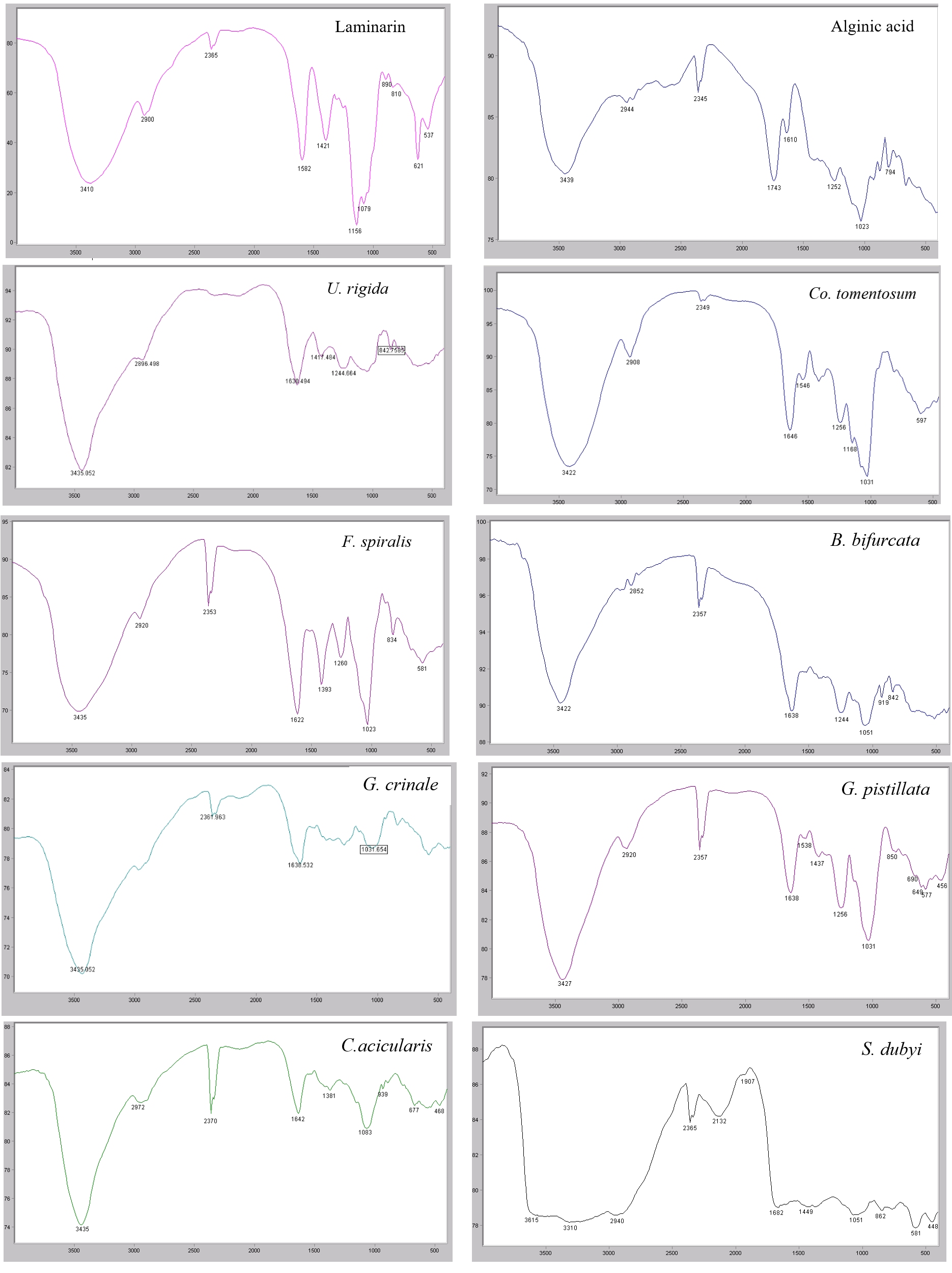 The FTIR spectra of polysaccharide standards (alginic acid and laminarin) and the eight seaweed polysaccharides in the range 350 - 4000 cm-1 are presented in figure 1. Each peak was assigned a functional group. Common to all polysaccharide standards and seaweed samples, two bands appeared in the 4000-2000 cm-1 region of the FTIR spectra: a broad band centred between 3500-3200 cm-1 assigned to hydrogen bonded O-H stretching vibrations and a weak signal at 2900-2800 cm-1 due to C-H stretching vibrations (Fernando et al., 2017). In addition, the medium to strong IR absorption bands at 1700-1600 cm-1 due to the carboxylate O-C-O bond stretching vibrations (Fernando et al., 2017) which is within the spectral range for uronic acid (Elnahas et al., 2017), this band was also common for all polysaccharides.