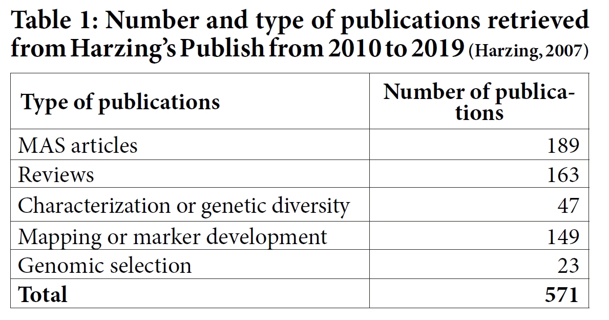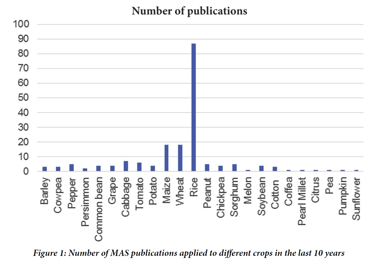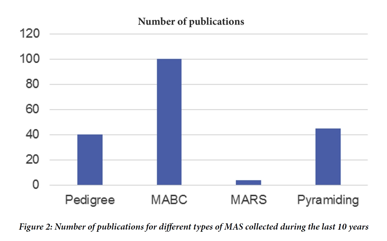 The MAS of smart breeding method is the method of choice for all breeders. It has been implemented in different crop programs. Several publications declare the application of MAS in crop improvement. But still the number of successful application of this method is less compared to the number of QTLs mapped or markers developed. Moreover, most marker associations are not robust enough for successful marker assisted selection (Young et al., 1999). By using Harzing’s Publsih or Perish software (Harzing, 2007) and using the query ‘Marker assisted selection’ in Google scholar and in Scopus between 2010 and 2019, around 571 publications were retrieved in which the title included ‘Marker assisted’. At first sight it was often difficult to distinguish from the title whether a publication is actually reporting a MAS application or if only potential MAS applications of the actual research outputs are discussed. Therefore, the publications were selected by reading the abstracts and sometime the material and methods to distinguish the real application of MAS. The results mentioned in table 1 is the number of publications harvested using MAS keyword. Among 571, only 189 publications were the real applications of MAS. Whereas, others publications were reviews of MAS (163 publications), QTL mapping or identification and/or marker development and validation (149 publications), Characterization and genetic diversity (47 publications) or genomic selection (23 publications). The MAS practical publications were dominant in rice with 87 publications (Figure 1), 29 of them are on bacterial blight diseases. The number of publications in other cereals was limited to 39 publications (18 publications in wheat, 18 publications in Maize and 3 publications in Barley). Marker assisted backcrossing (100 publications, Figure 2) has been most widely and successfully used up-to-date. It has been applied to different crops, e.g. rice, wheat, maize, barley, pear millet, soybean, tomato, etc. compared to other methods such as pedigree method (40 publications), pyramiding (45 publications) and MARS (4 publications).