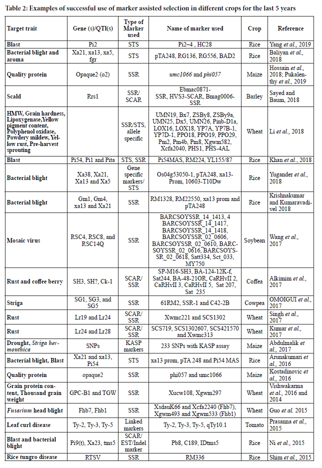 Marker assisted selection (MAS) is ‘smart breeding’ or fast track plant breeding technology. It is one tool utilized in breeding companies and research institutes for fast development of improved varieties, giving possibility to select desirable traits more directly using DNA markers. In this review, we discussed the use of MAS in biotic, abiotic, quality and other agronomic traits. Besides, we emphasized the importance of MAS at ICARDA and underlined the successful application of MAS in the last 10 years. The use of molecular markers makes the process of selecting parental lines more efficient based on genetic diversity analysis. It can aid the conventional breeding, especially for certain biotic and abiotic traits laborious to manage. Still, MAS contributed very little to the release of improved cultivars with greater tolerance to abiotic stresses, with only a few exceptions. MAS was extensively used to improve rice varieties, mainly resistant to bacterial blight and blast disease and was applied in drought tolerance along with GPC (Grain protein content) in quality traits. MAS at ICARDA is used to characterize new parental materials for disease resistance genes as well as in screening advanced lines with a focus on association mapping and identification of new QTLs. The application of MAS increased in the last decade. It is more and more used in different crops. However, rice is still the dominant crop in terms of number of publications using MAS.
